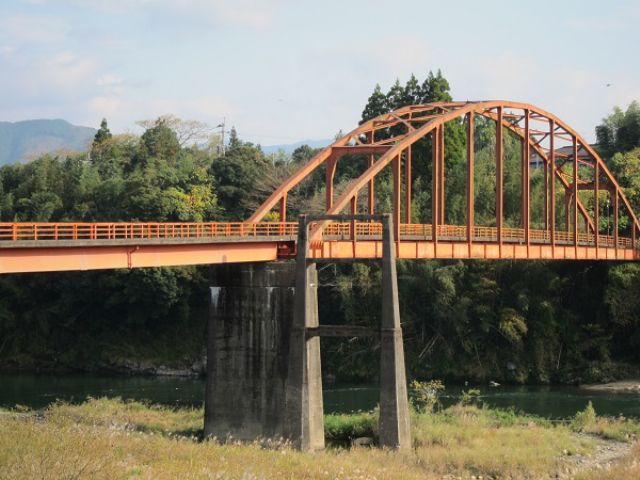 その紅取橋のすぐ下流にオレンジ色に近い紅色のアーチ形が特徴の橋があります。